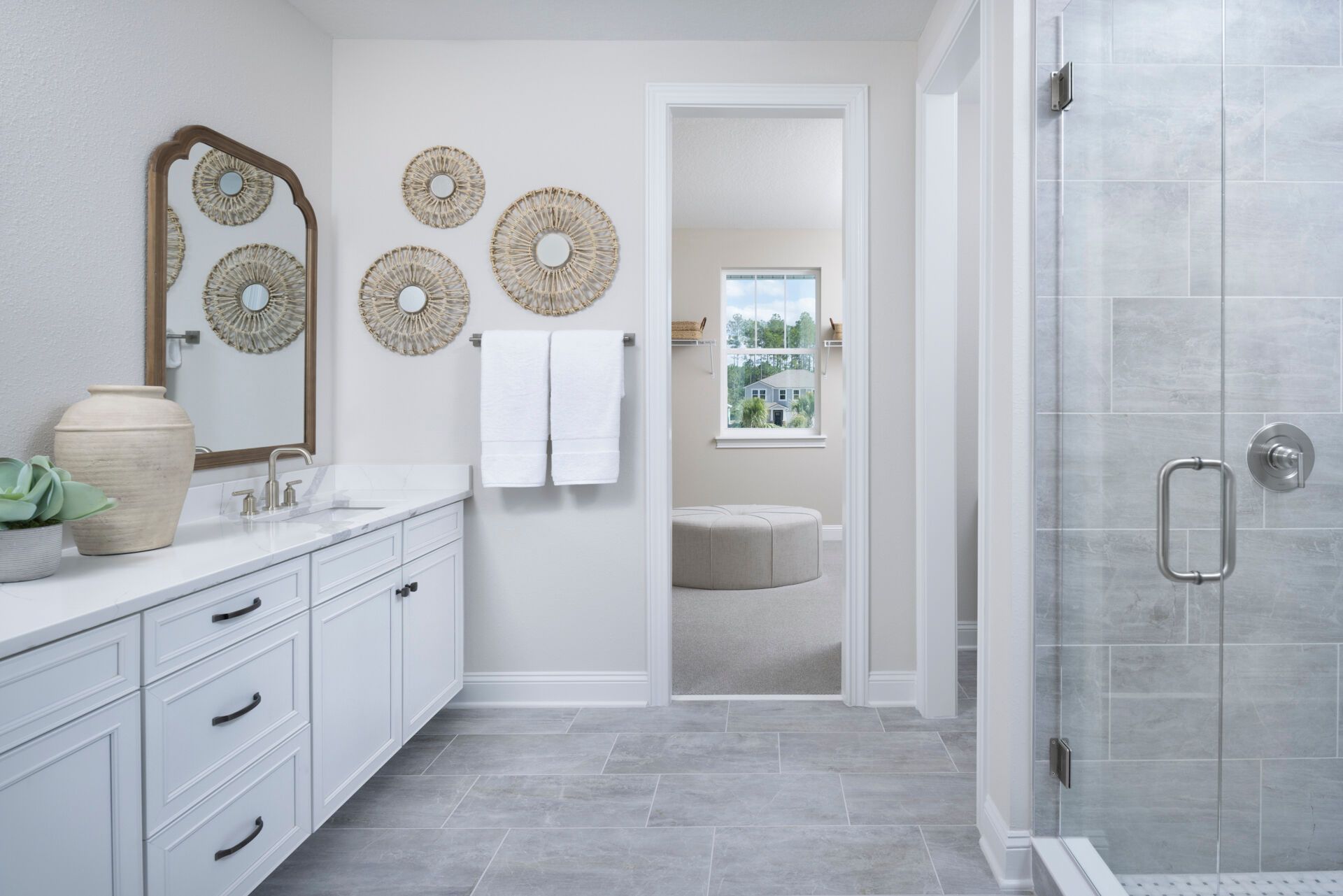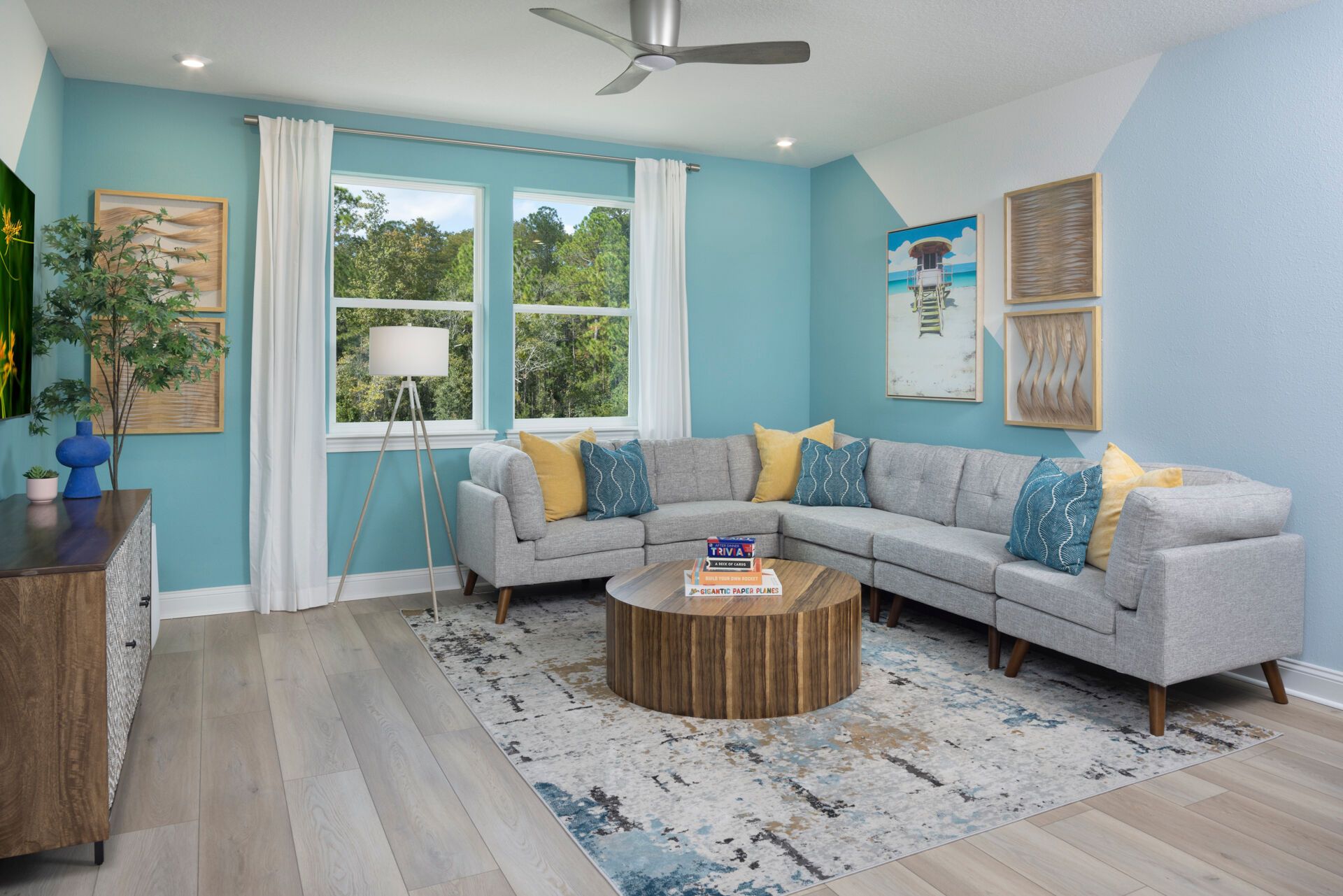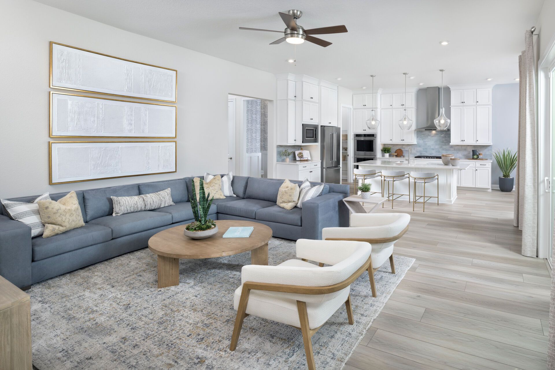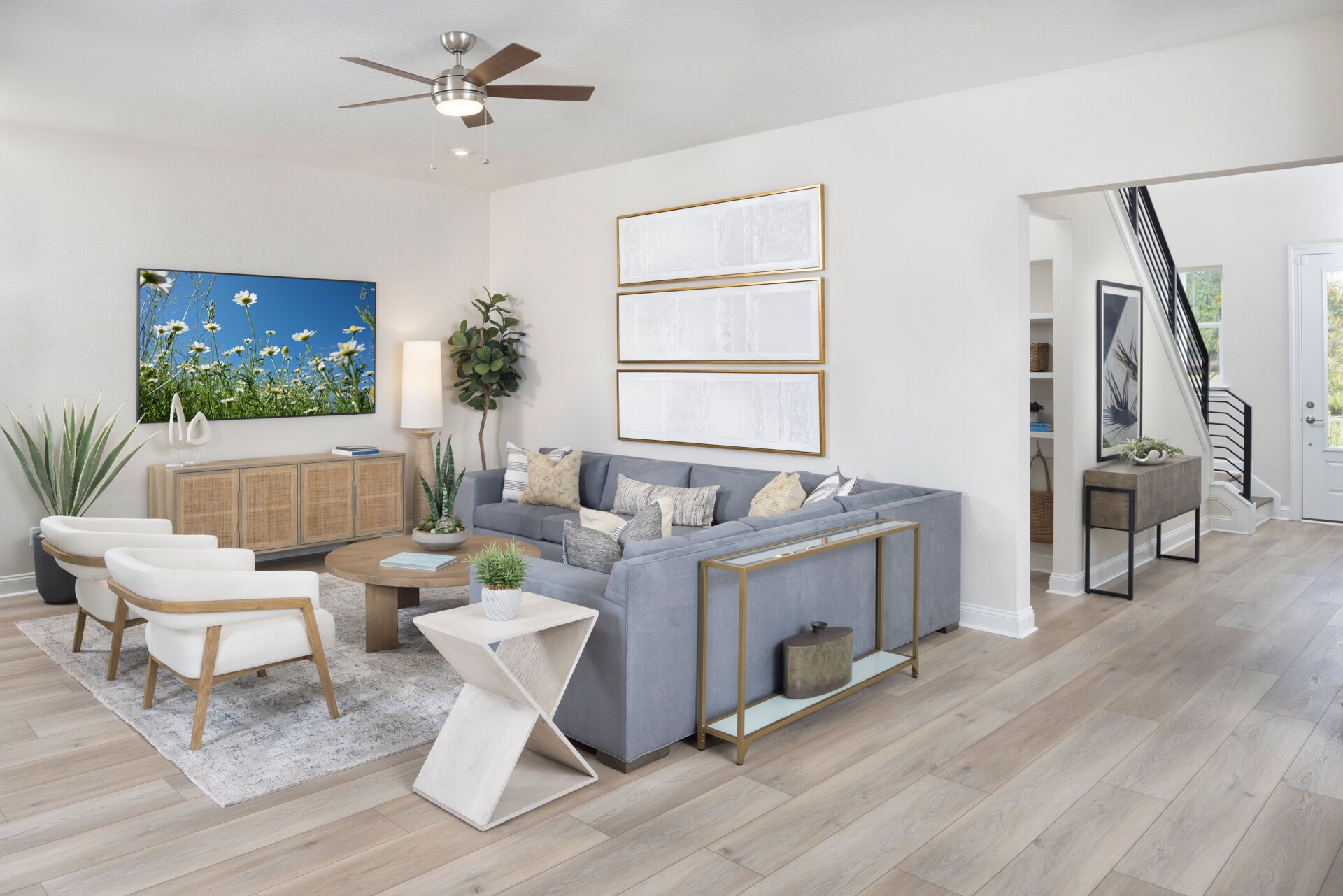 The Rowan welcomes you with a bright and inviting foyer that opens into a spacious Great Room, beautifully illuminated by natural light streaming through the covered lanai and enhanced by a stunning 12 multi-sliding glass door that seamlessly connects indoor and outdoor living. The island kitchen overlooks both the Great Room and dining area, creating a natural gathering space perfect for everyday living and entertaining. A study in lieu of the flex room provides a dedicated area for working from home, reading, or pursuing hobbies. Thoughtful details like a convenient stop-and-drop at the owners entry and a 2-car tandem garage add functionality to the homes design. Upstairs, an expansive loft offers a versatile space and thoughtfully separates three secondary bedrooms from the private Owner's Suite, which features a spacious walk-in closet and a well-appointed bath with dual vanities. Completing the homes charming curb appeal is the beautiful Coastal elevation, giving the Rowan a light, breezy style that perfectly complements Florida living.