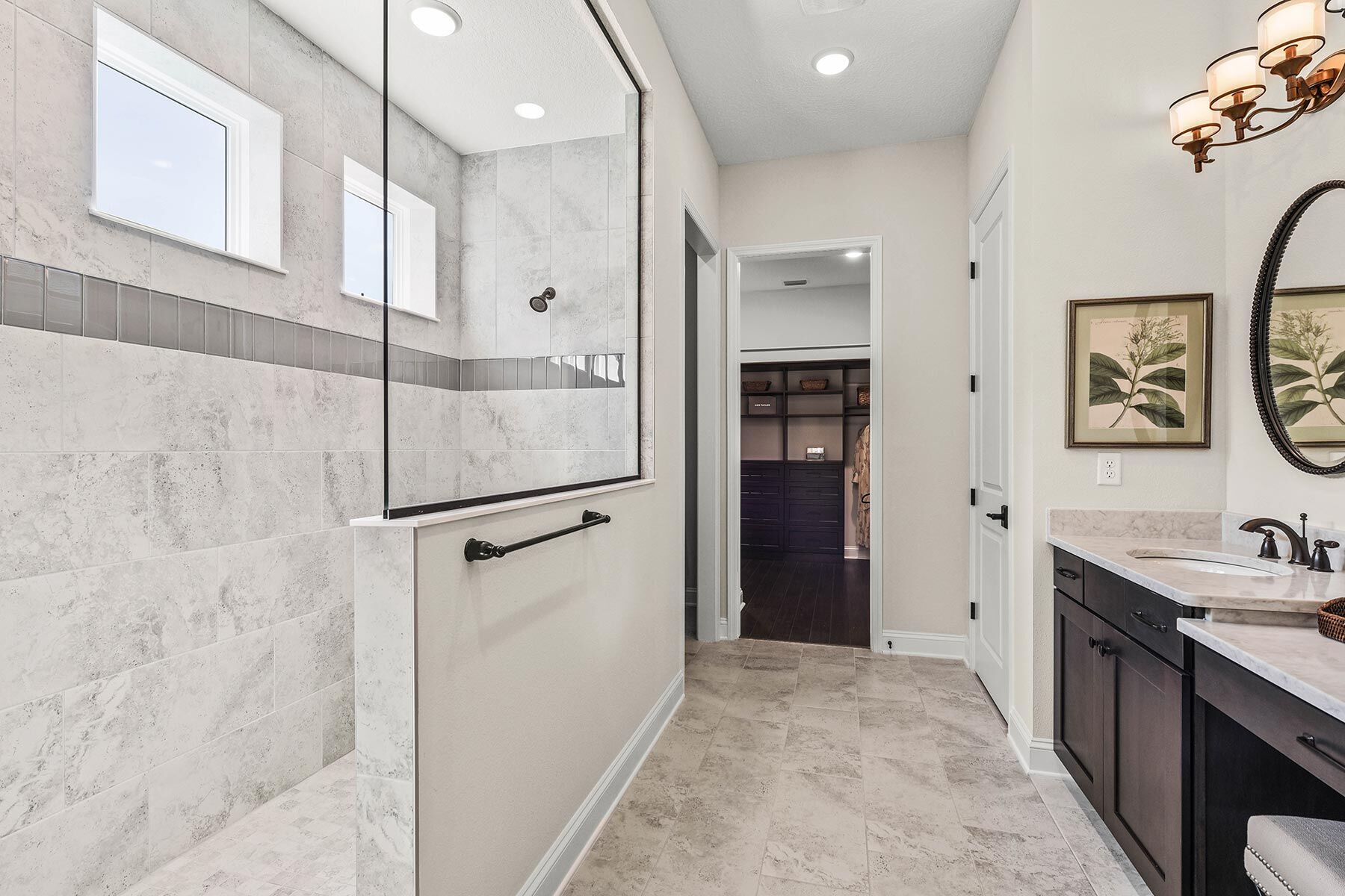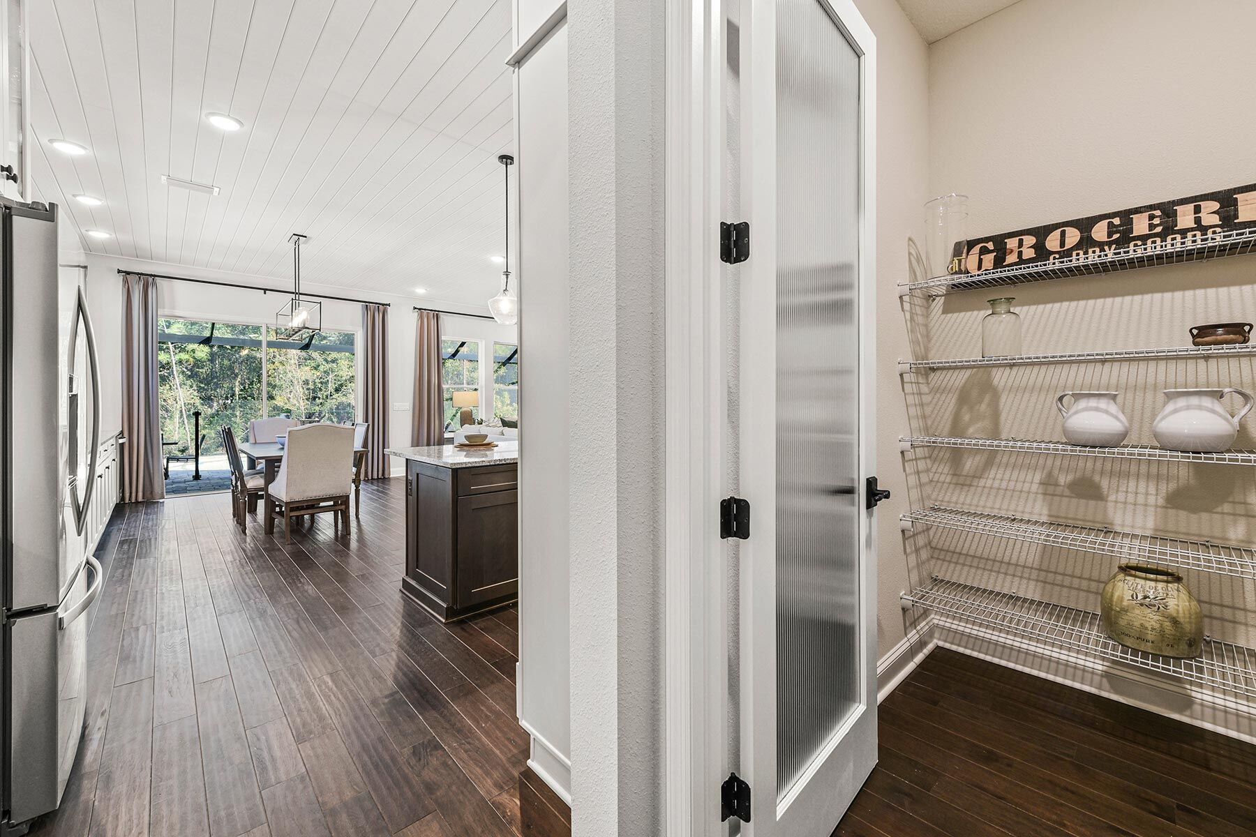 This Bridge floorplan with a Low Country elevation features a bright, open layout enhanced by abundant natural light and thoughtful design upgrades. The classic foyer leads past a secondary bedroom with a full bath and into a third bedroom in lieu of the flex room, offering added space for family or friends. At the heart of the home, the kitchen with its island and breakfast bar flows seamlessly into the spacious Great Room. A 12' sliding glass door opens to the extended covered lanai, creating an inviting space for indoor-outdoor living. The Owners Suite is a private retreat with large windows, a generous walk-in closet, and a spa shower for a luxurious finishing touch.