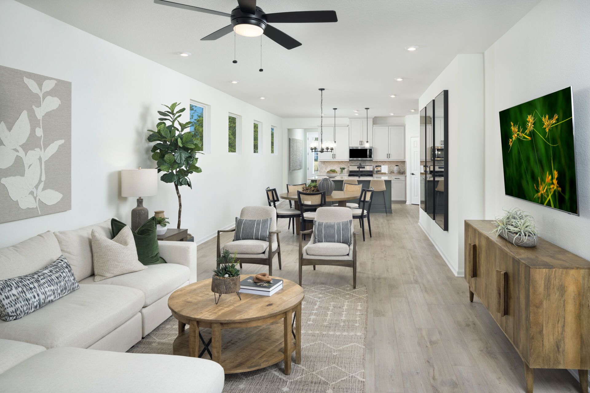 The Valeria floorplan pairs timeless charm with effortless functionality, highlighted by its stunning Low Country elevation that delivers classic curb appeal with welcoming Southern character. Inside, a thoughtfully designed open-concept layout creates the perfect setting for both everyday living and entertaining. The dining area flows seamlessly into the spacious Great Room, which overlooks the covered lanaiideal for relaxing evenings or hosting guests. The designer-coordinated kitchen is filled with natural light and features a walk-in pantry and flush breakfast island, offering both style and convenience. Bedrooms 2 and 3 are privately positioned near a shared full bath and linen closet, while the owners suite serves as a serene retreat with a spa-inspired bath and an expansive walk-in closet complete with a linen shelf. A centrally located laundry room, tucked between the foyer and the 2-car garage, adds everyday ease while maintaining the homes polished aesthetic.