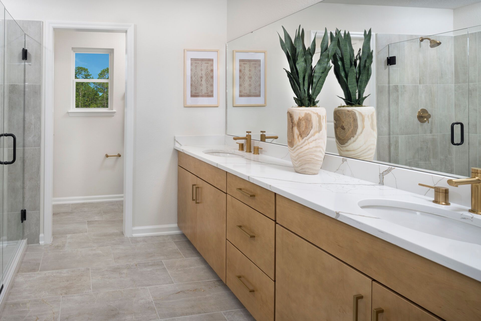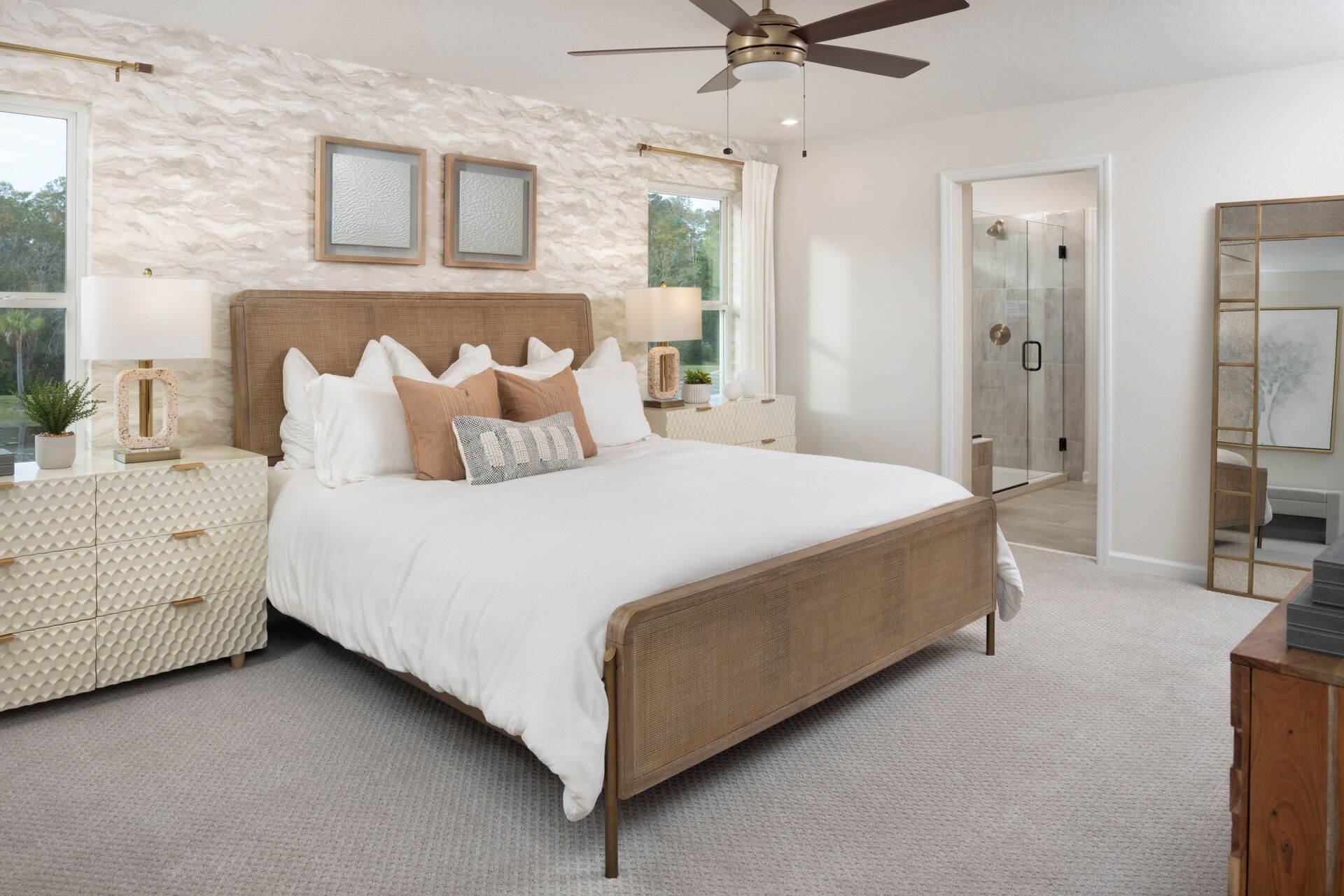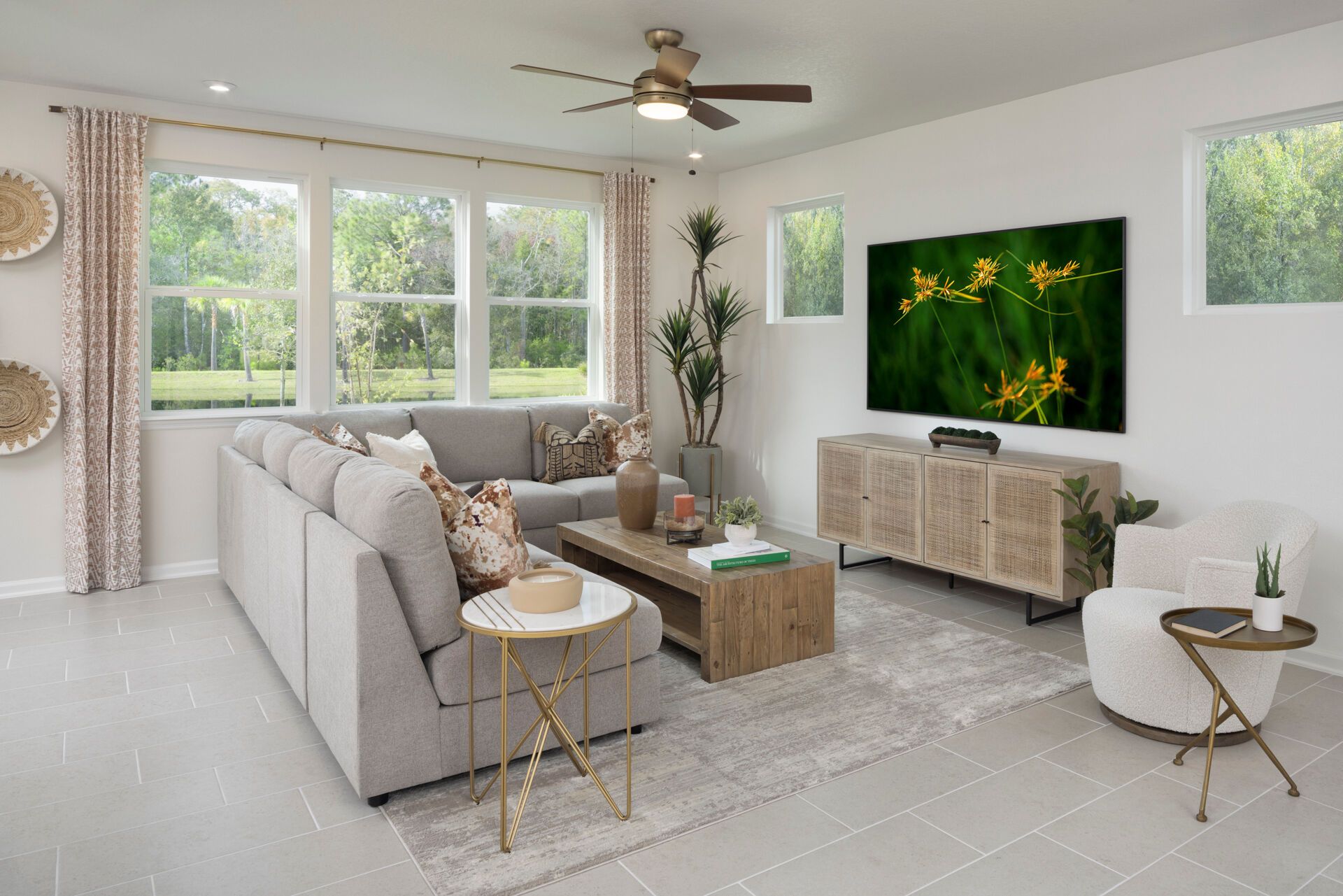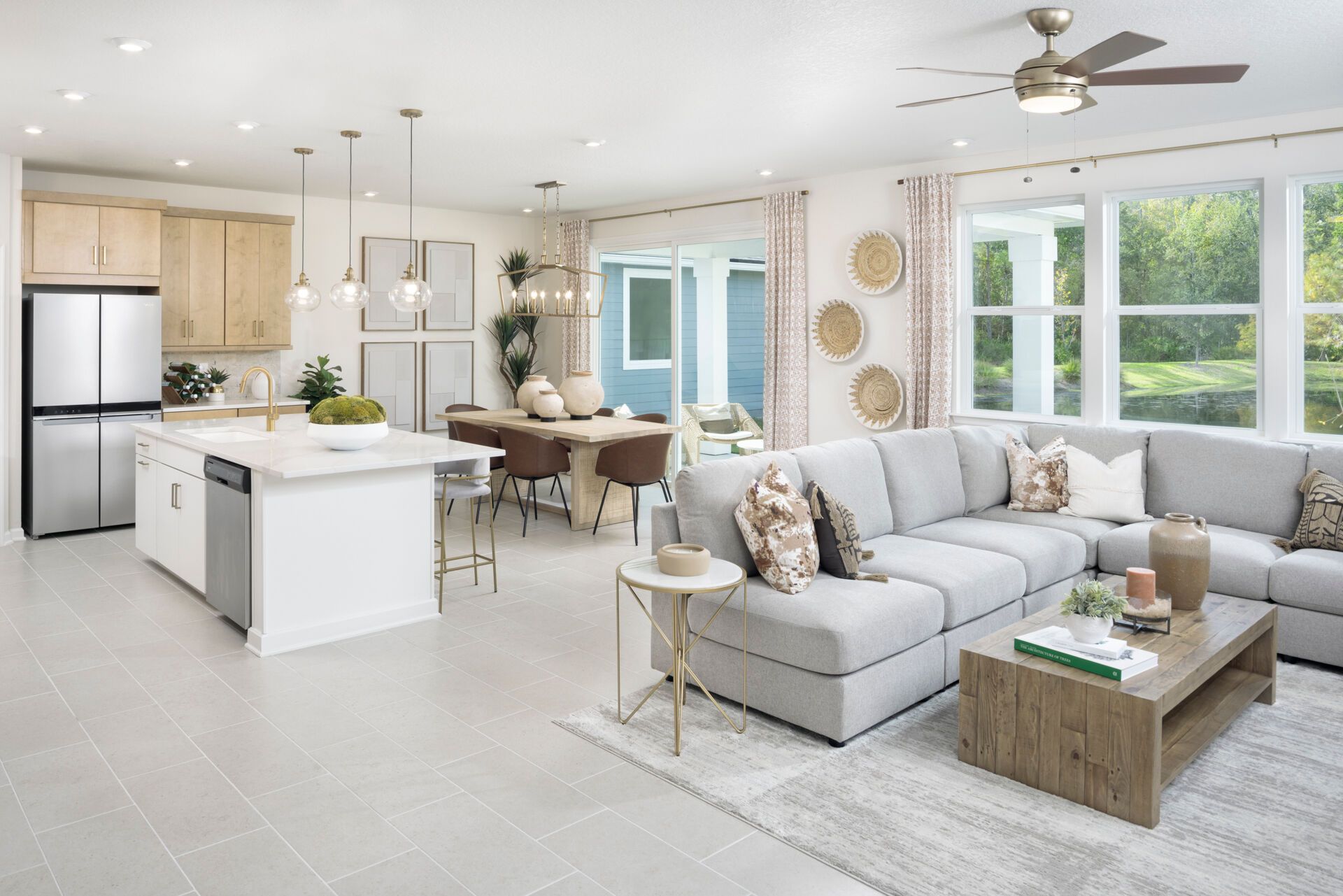 The Riley combines modern comfort with inviting farmhouse character, highlighted by its charming Low Country Elevation and thoughtfully designed layout. The main level features an airy open-concept living space where the stylish kitchen, dining area, and welcoming Great Room flow together seamlessly, all extending to the covered lanai for easy indoor-outdoor living. A standout element of this plan is the expansive walk-in pantry, which wraps around the corner and extends beneath the stairs to offer exceptional storage. Upstairs, the luxurious owners suite provides a private retreat with dual sinks, a linen closet, and a spacious walk-in closet. Two additional bedrooms share a well-appointed full bath, while a generous loft and conveniently located laundry room complete the second floor, making the Riley both beautifully designed and highly functional for everyday living.